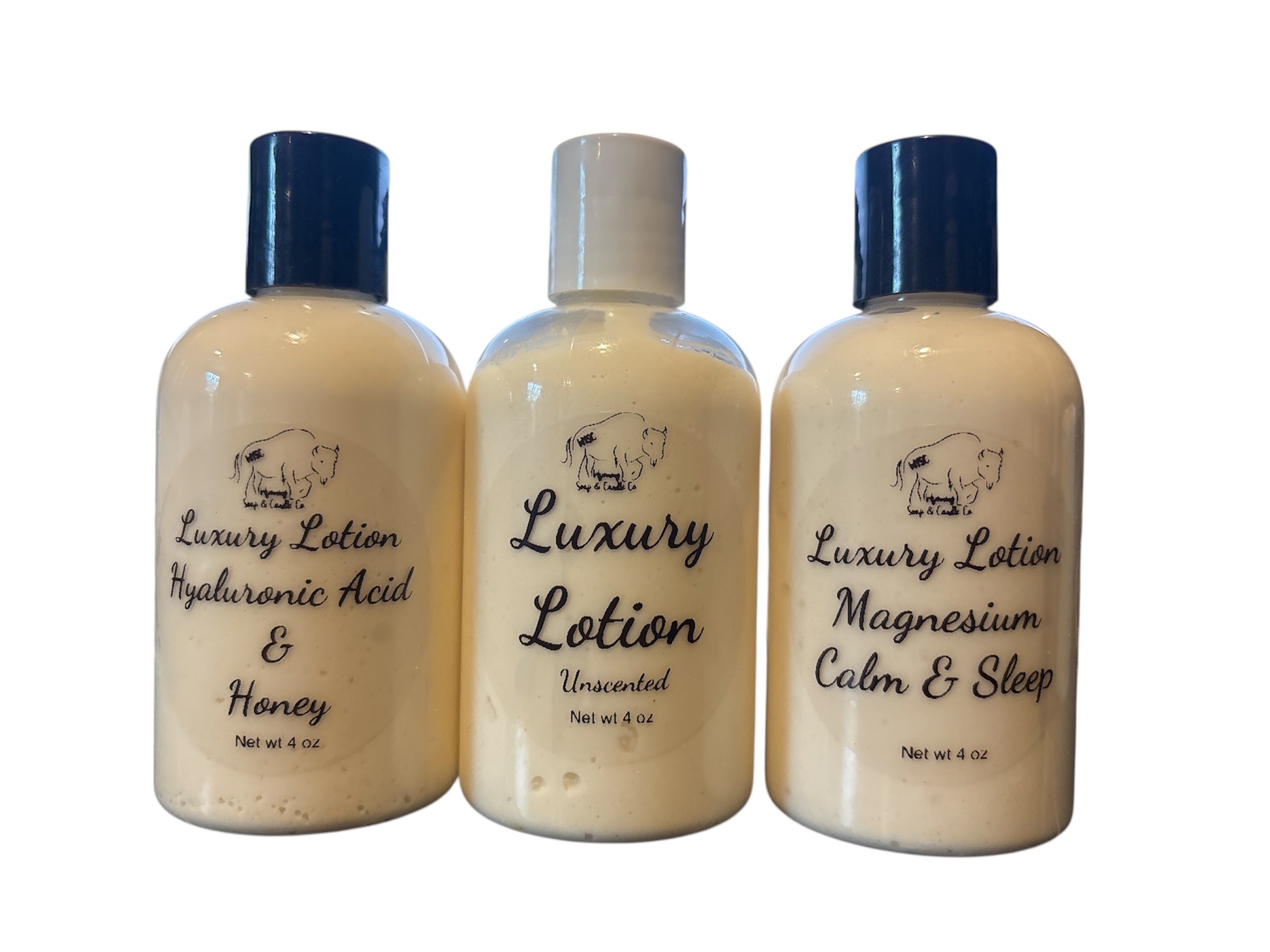 This new Luxury Lotion is all natural, paragon and phthalate free. All of the ingredients were specially selected to provide specific benefits for optimal moisture, healing and repair. The Unscented option is my premium luxury lotion base with no additional additives. The other two, Hyaluronic Acid & Honey and Magnesium Calm & Sleep, have a couple added ingredients with extra benefits.