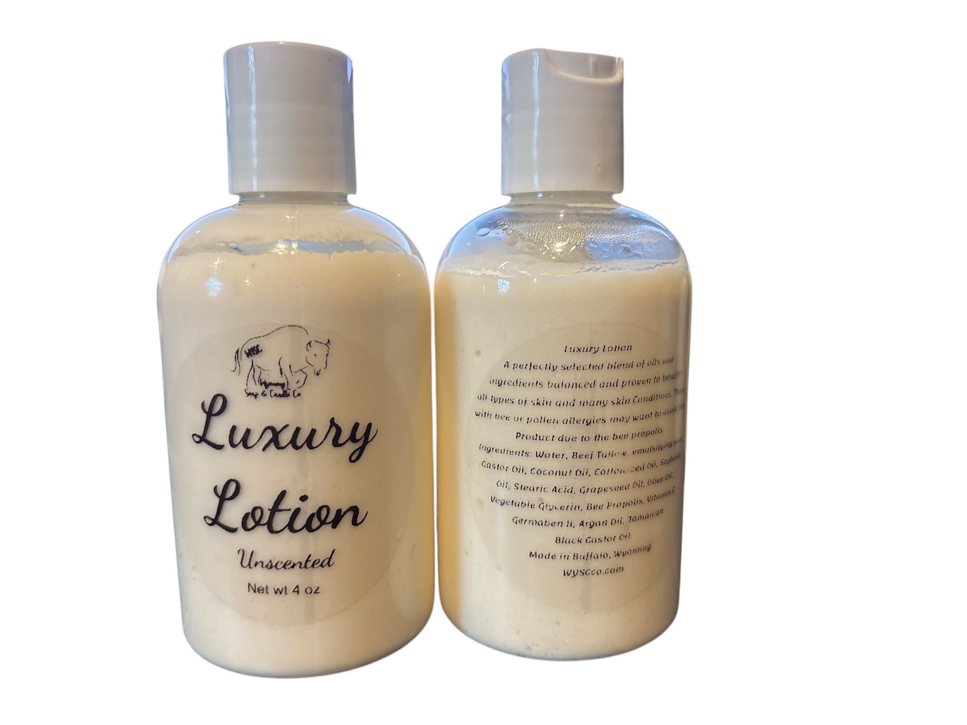 Luxury Lotion Ingredients: Water, Beef Tallow, Emulsifying Wax. Castor Oil, Coconut Oil, Soybean Oil, Cottonseed Oil,Stearic Acid, Glycerine, Bee Propolis, Grape Seed Oil, Olive Oil, Vitamin E, Germane II, Argan Oil & Jamaican Black Castor Oil.
